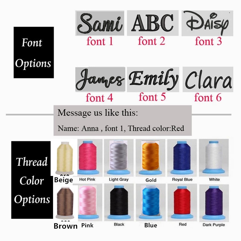 If you placed the order of Custom Name. Please choose the Font type and the thread Color which you need: