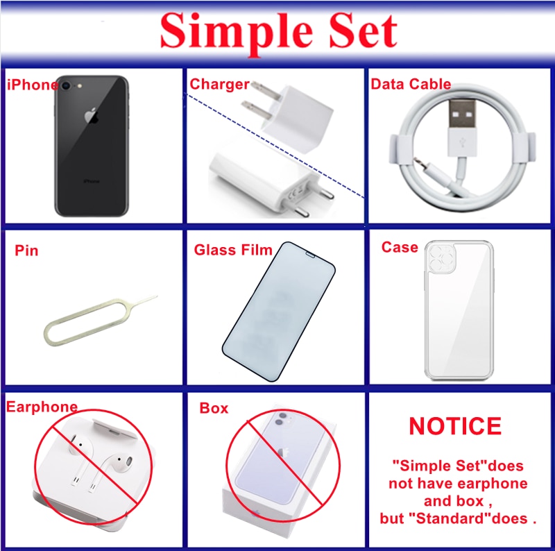 "64GB simple set" means you will get iPhone11 64GB with Wall charger + Data cable(No original box, No earphone);