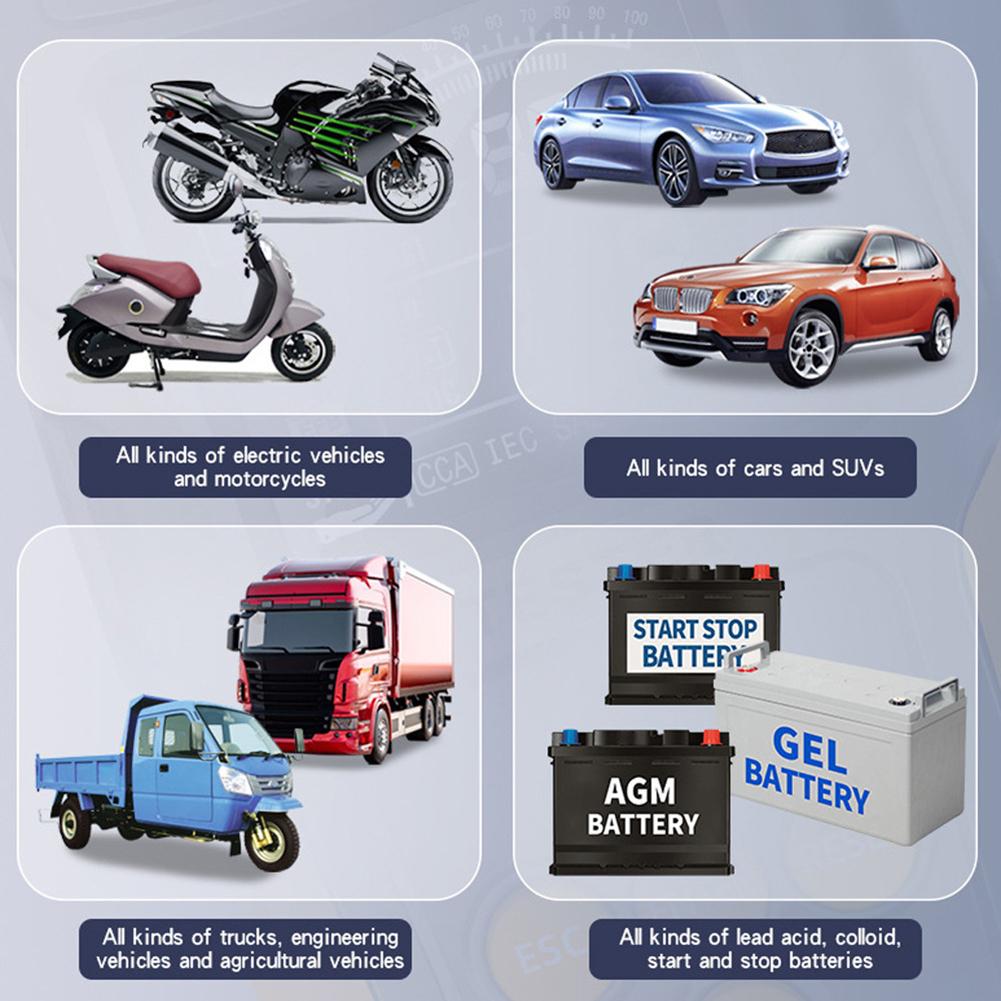 The FBT200 battery analyzer can detect all automotive 12v and 24V lead acid batteries, such as regular flooded batteries, AGM flat plate batteries, AGM spiral batteries and GEL batteries for cars, SUVs, light trucks, motorcycles and more. It gives you accurate test results in just 3 seconds based on SAE,DIN, IEC, EN, CA, JIS standards.