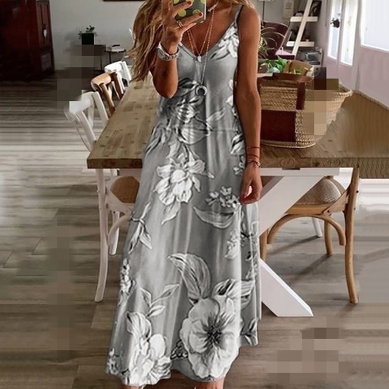 S-5XL 7Colors Floral Printing V-Neck Strap Long Dresses Casual Bohemian Sleeveless Women Summer Beach Travel Party Wear
