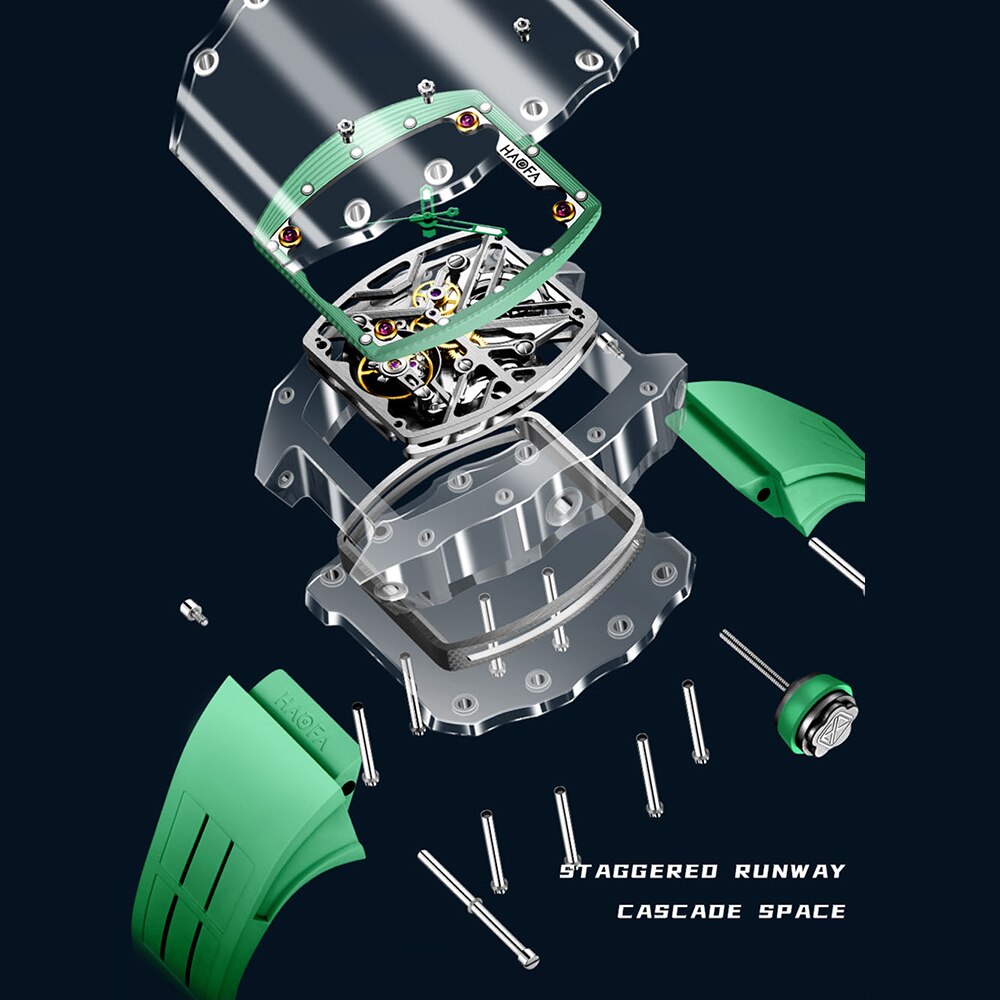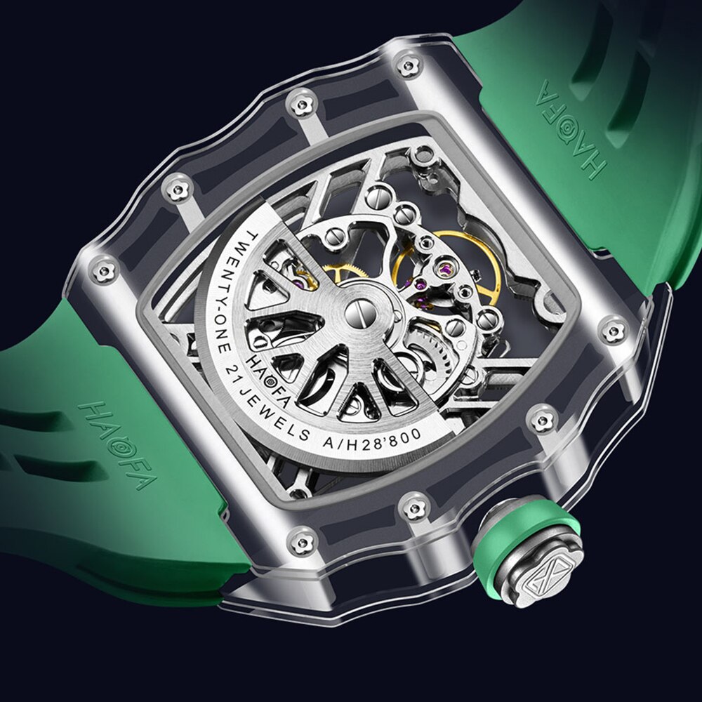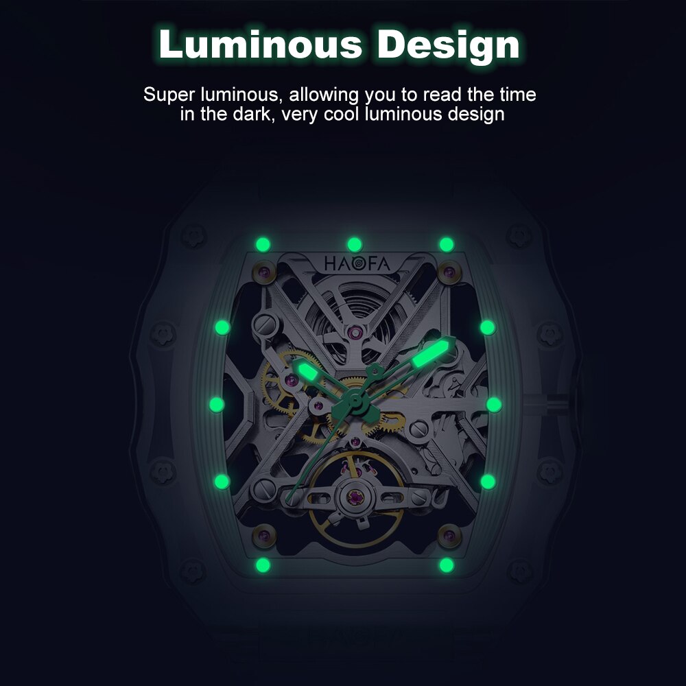 Fully Transparent Crystal Glass Case with Double-sided hollow dial, panoramic back transparent, for you to capture the mechanical scenery. Trendy Color Matching, Bright colors interact with transparent elements. It is like a movement floating between the wrists, presenting a cool sci-fi visual sens.Tonneau appearance, Unique and highly recognizable. Simple three-pin design, eye-catching and easy to read. High-definition luminous coating, no fear of the dark.