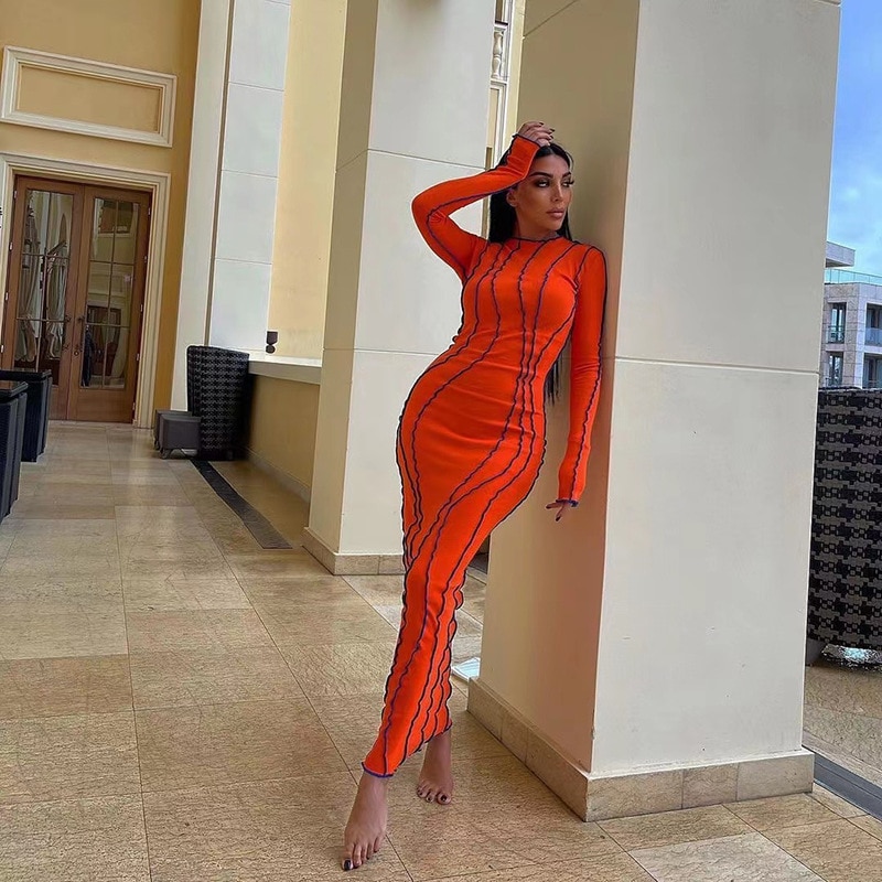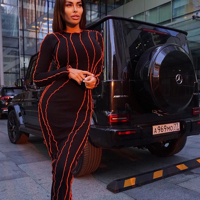 Stripe Women's Dress Sexy Bodycon Hip Package Midi Dresses Female 2023 Spring White O-neck Long Sleeve Party Club Lady Vestidos