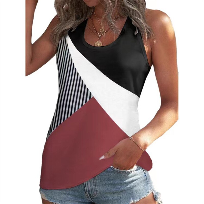 Summer Geometric Print Color Blocking T-Shirt Fashion Women's Sleeveless U Neck Cotton Tees Female Daily Casual Loose Tops Vest