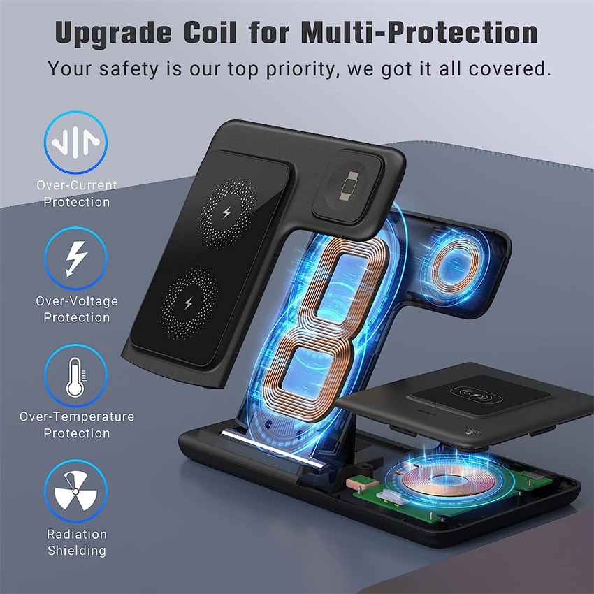 [Safe Wireless Charger Stand] Wireless charging station for apple with over-current protection, over-voltage protection, over-temperature protection, and foreign object detection function. Reasonable internal circuit of the wireless charging station for apple design prevent overcharge damage to the equipment battery and ensure safe and fast charging of the device.