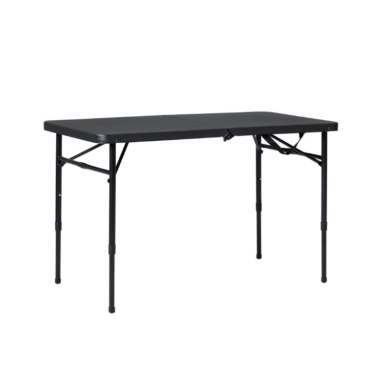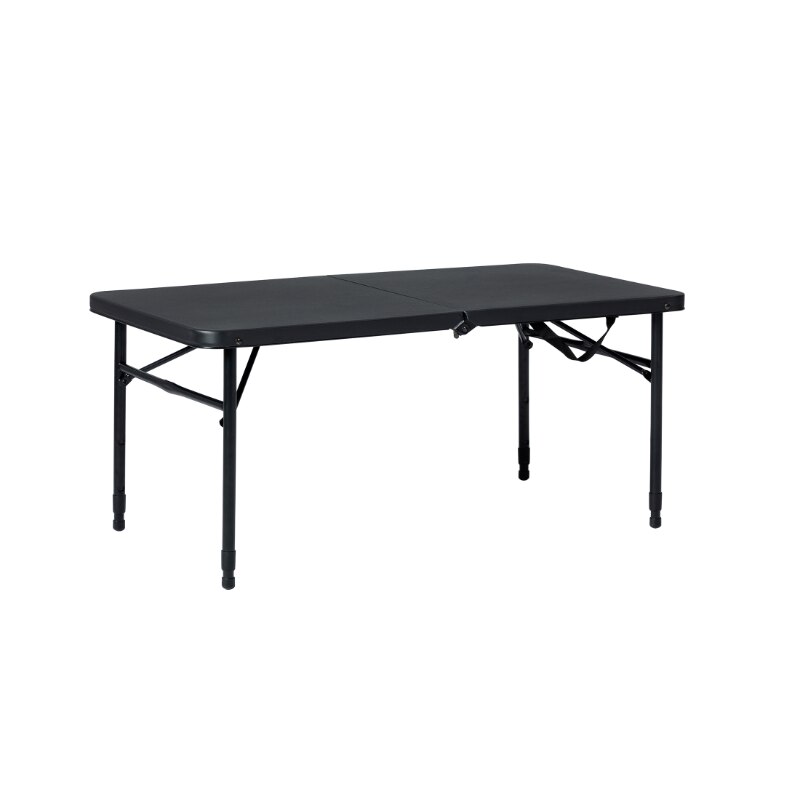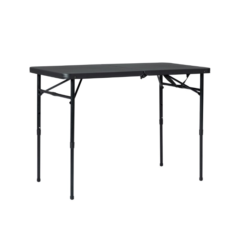 Provide all of the tablespaces that you need in all kinds of settings with the Mainstays 40" Fold-in-Half Table in Rich Black. This versatile rectangular table is sturdy and durable, made with reliable materials, folds for easy storage and transportation, and adjusts to three different heights. When you're finished using it, just fold in the metal legs, fold the table in half, and your new compact table is ready for transport! Its classic black color is sure to fit in at any gathering in any setting, and its spacious expanded 40" long table-top is ideal for holding a wide variety of foods, crafts, or whatever items you are working with! It's great for everyday use both indoors and outdoors, as a serving table, craft supply table, outdoor meal table, or for whatever purposes you may need. The plastic tabletop is easy to clean with no fuss just wipe it down with a damp cloth, and it will look as good as new! The carrying handle makes it perfect for taking on the go, for outdoor barbecues, game nights, school activities, parties, or tailgating events. The tabletop is large enough to be able to sit the whole group down around the table, so all of your friends and family can be included.
