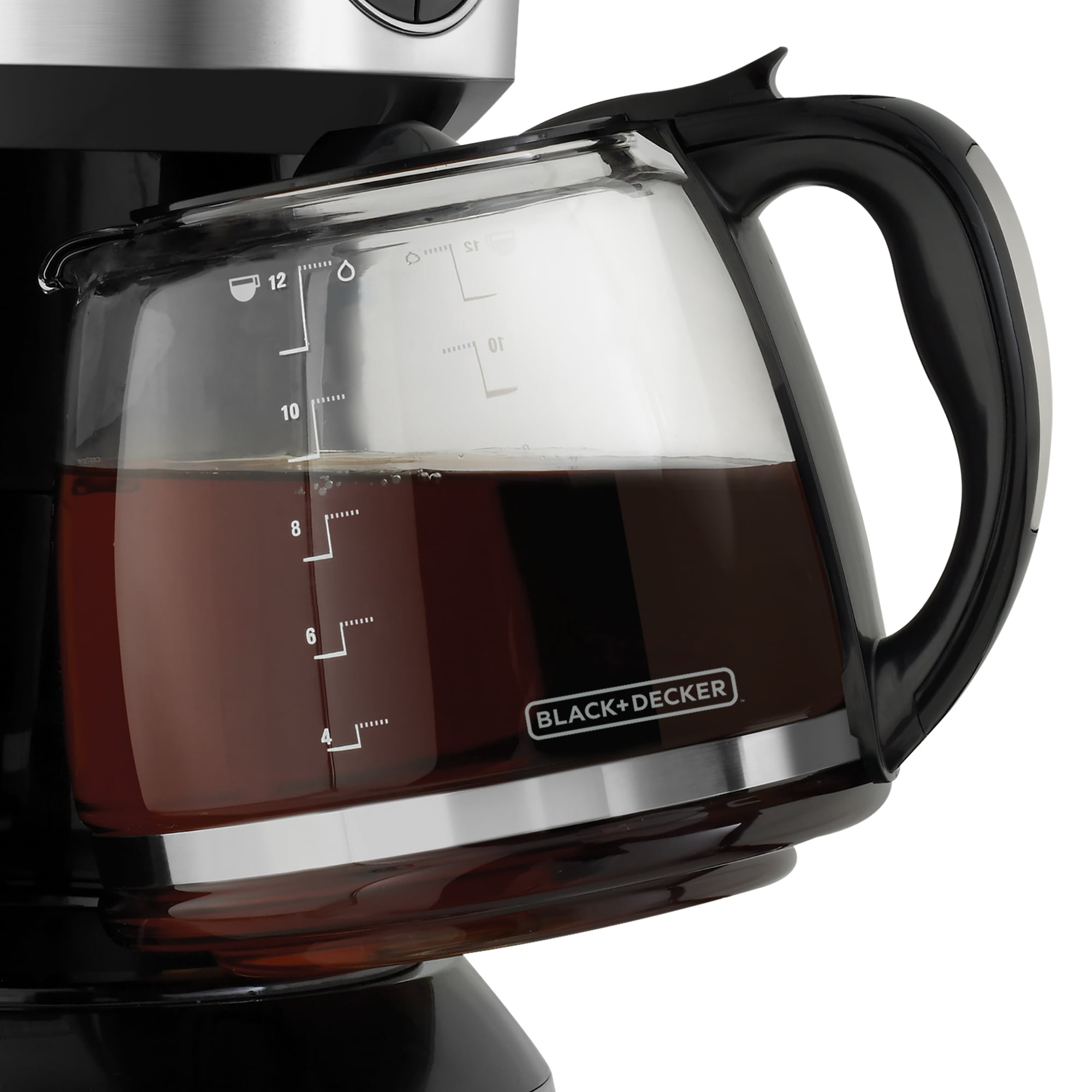 • Duralife™ Glass Carafe: The sturdy 12-Cup* carafe has measurement markings for accurate filling and an easy-grip handle for comfortable pouring.