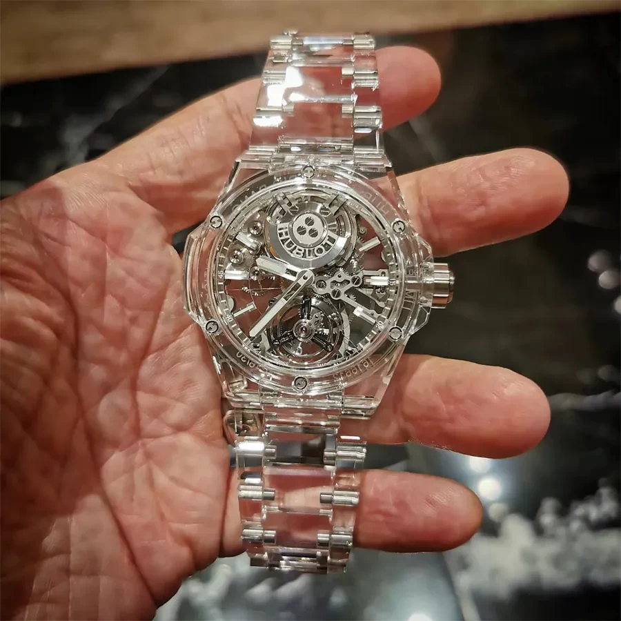 Phiên bản Đồng Hồ Nam Hublot Integral Tourbillon Full Sapphire Watch 455.JX.0120.JX xứng đáng là món phụ kiện dành cho quý ông trong, thách thức mọi ánh nhìn. Hãng đã tạo ra độ trong suốt cao với dây đeo sapphire, điều này cũng khiến nó trở thành một kỳ tích đầy thách thức để đạt được. Ricardo Guadalupe, Giám đốc điều hành của Hublot từng đánh giá về chiếc đồng hồ độc đáo này: "Đối với một sáng tạo đặc biệt như vậy, chúng tôi đã chọn bộ máy Automatic Tourbillon mới với các cầu nối bằng sapphire của nó, độ trong suốt của nó tạo nên một cảnh tượng tuyệt đẹp".