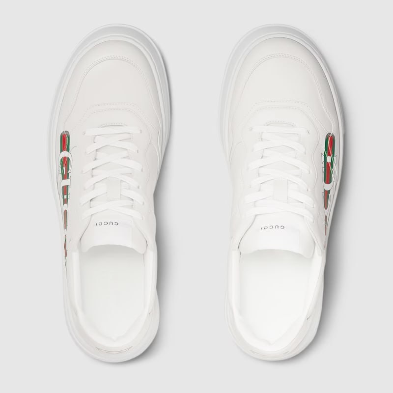 This sneaker's chunky silhouette gives it a playful, retro feel. Gucci's collections continue to look to other eras. This pair of sneakers is crafted in white Demetra, a material created with the same processes used for tanning, the new material offers pliable and resilient performance with a supple finish. A Gucci Web print completes the style.